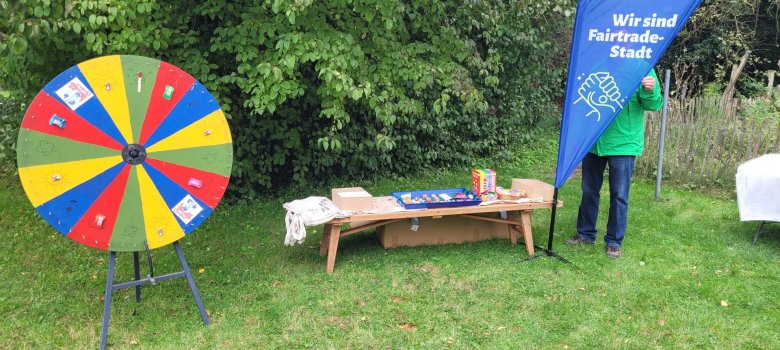 Die Fair Trade Beachflag wies den Weg zum aufgebauten Glücksrad, an dem Kinder und Erwachsene Preise gewinnen konnten. Für die kleinen gab es fair gehandelte Schokolade sowie als Hauptpreise einige kleinere Püppchen; für die größeren Fair Trade Beutel mit ausgewählten Informationen zum fairen Handel sowie leckeren Tee.